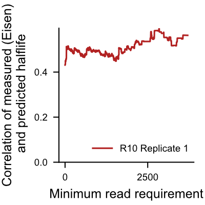 Note that the calculated halflives pred_t5 are the most reliable for transcripts with high read count. The following plots show correlation of halflives computed from RNAkinet predictions with experimentaly measured halflives [1] as we increase read count requirement. We recommend users to acknowledge this and put more confidence in halflife predictions for transcripts with high read count, and less confidence for transcripts with low read count.