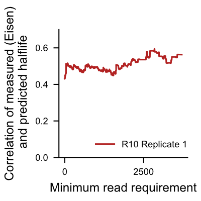 The following plots show correlation of halflives computed from RNAkinet predictions with experimentaly measured halflives [1] as we increase read count requirement.