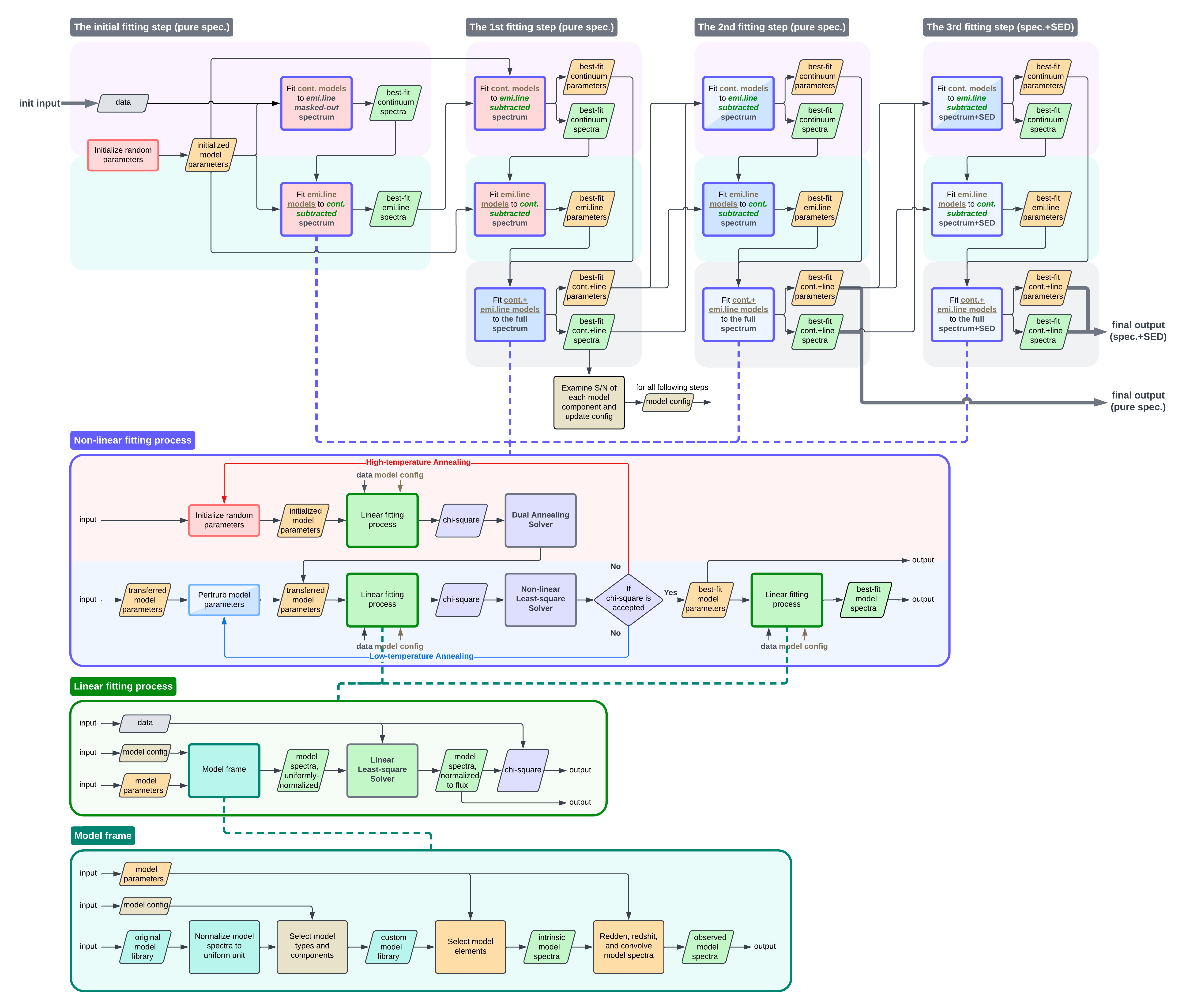 The full fitting pipeline of S3Fit is shown in the following flowchart, with a detailed description of the fitting strategy in manuals.