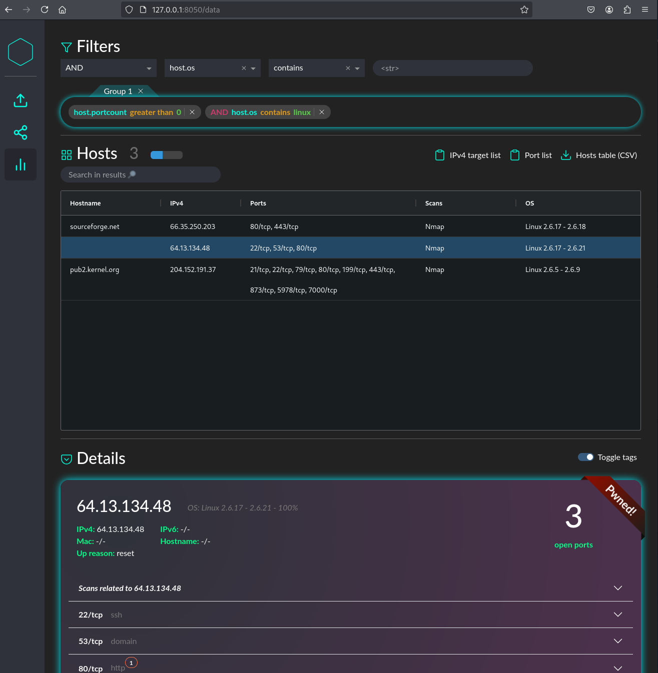 - Chain modular drop-down filters to select relevant hosts based on their address, tag, open ports, script outputs, scans, OS, etc.