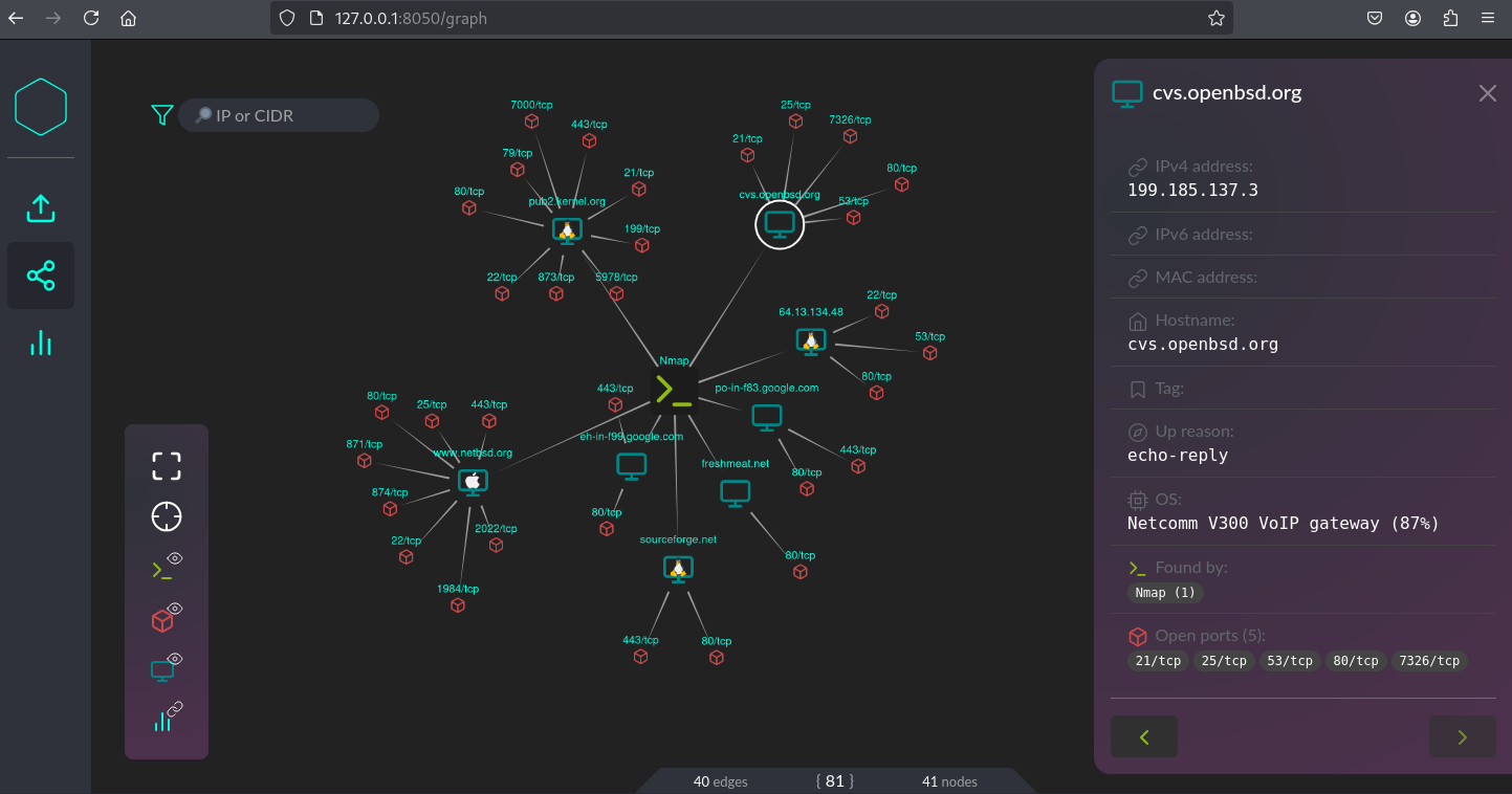 - View scans, hosts and open ports in an interactive graph with details for every node