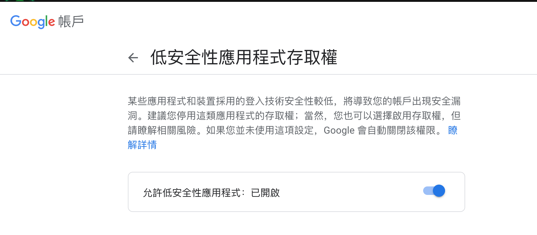 開啟 Google 低安全性 https://myaccount.google.com/lesssecureapps
