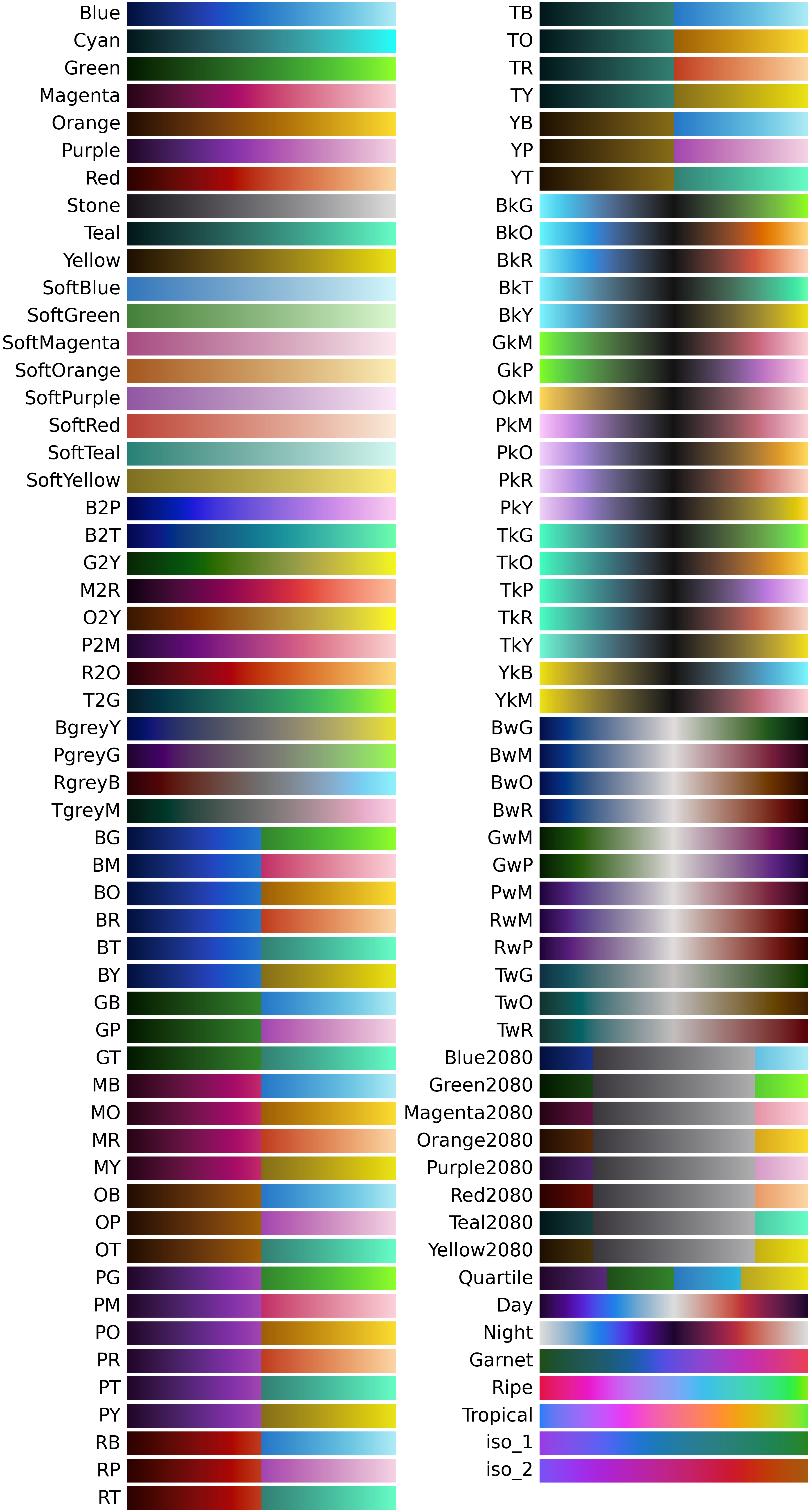 - cmocean: A relatively small set of perceptually uniform colour maps, with a design clearly catered for geographic and oceanographic use. Of note is the
