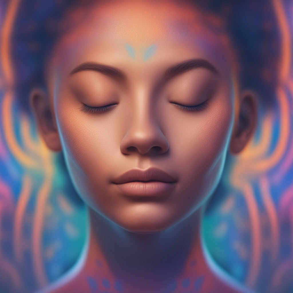 "Vibrant, Headshot of a serene, meditating individual surrounded by soft, ambient lighting.")