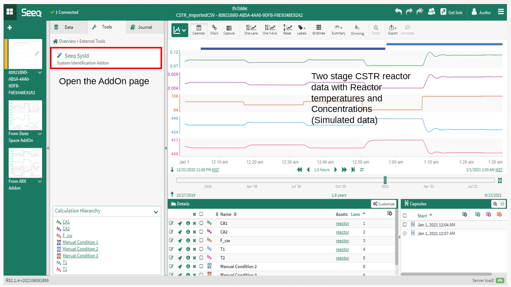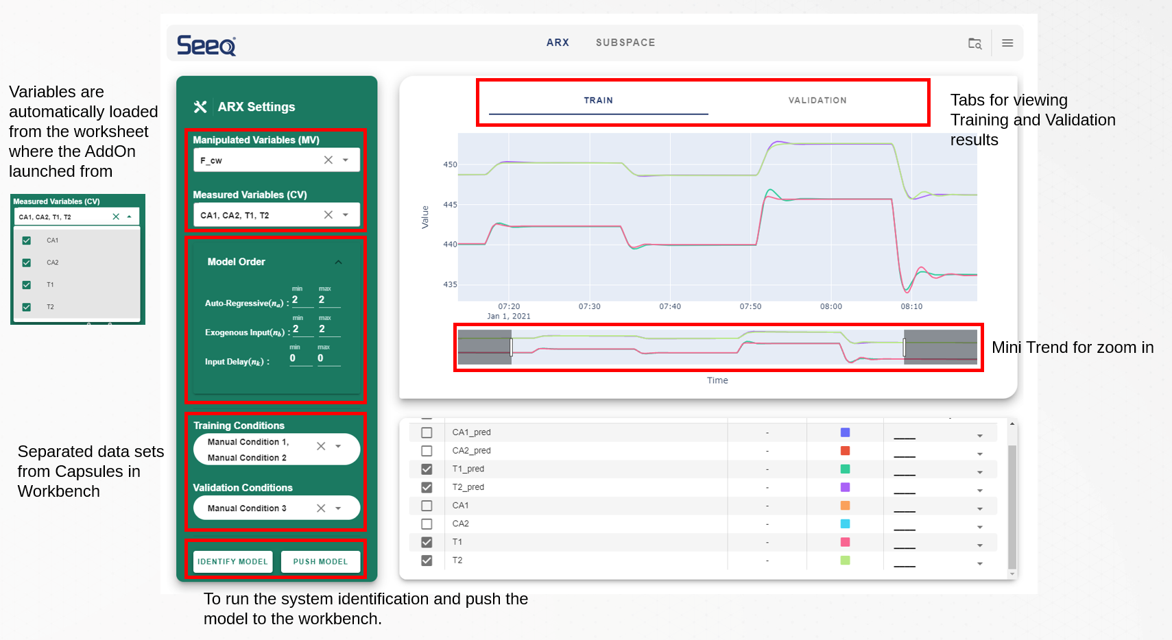 A Seeq Add-on built in python to identify input and output relationship for the system to create digital twin models for various analytics and machine learning tasks. System dynamics are identified thereby allowing users to get dynamic predictions quickly. The Add-on is fully integrated with Seeq Workbench. Cleaned and contexutalized data from Seeq workbench can be used to identify dynamic models; the models can be pushed back into Seeq workbench. This framework supports both adhoc investigations as well as streaming predictions. The system identification framework can be used for a variety of tasks including simulation, digital twin construction, advanced process control, real time optimization, etc.