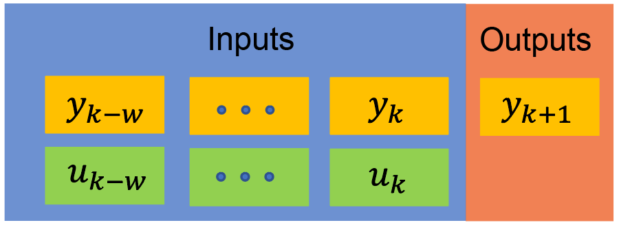 ARX model is a system identification model that uses the linear correlation between previous and future values. ARX model consists of previous output terms (y) and previous input (u) terms multiplied by the linear coefficients (a, b). The linear combination of past input and output value computes the one-step-ahead prediction of output value(yk+1).