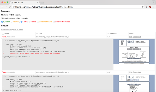 SeleniumBase automatically handles common WebDriver actions such as spinning up web browsers, waiting for page objects to load, saving screenshots during test failures, using a proxy server, and more. (Read about customizing test runs.)