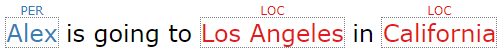 print(tagged) # [Alex](PER) is going to [Los Angeles](LOC) in [California](LOC)