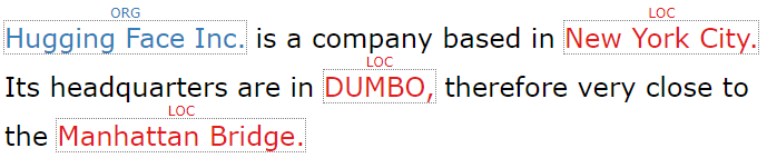 text = "Hugging Face Inc. is a company based in New York City. Its headquarters are in DUMBO, therefore very " \