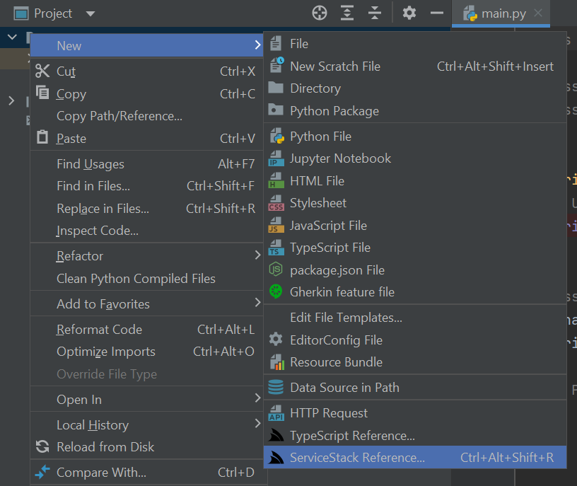 Python developers of PyCharm Professional and FREE Community Edition can get a simplified development experience for consuming ServiceStack Services by installing the ServiceStack Plugin from the JetBrains Marketplace: