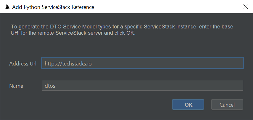 To launch the Add Python ServiceStack Reference dialog where you can enter the remote URL of the ServiceStack endpoint you wish to call to generate the Typed Python DTOs for all APIs which by default will saved to dtos.py: