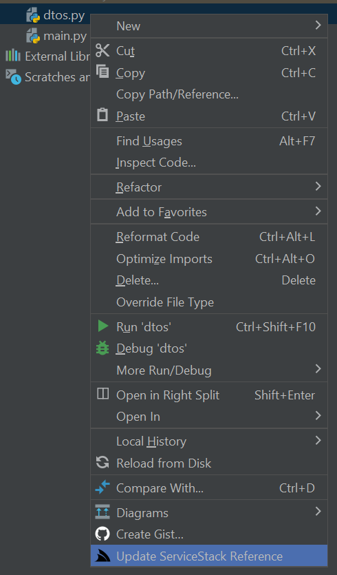 If any of the the remote APIs change their DTOs can be updated by right-clicking on dtos.py and clicking Update ServiceStack Reference: