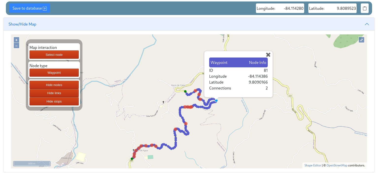 Shapes are made with nodes, nodes have a type, it could be endpoint for start or end of shapes, stops, these can be part of the shape too, fork are the nodes where are more than two links, waypoint are the common nodes. To create a Shape first draw paths clicking on map with the interaction add_node, when you already have a connection between two endpoints through multiple nodes and links add a Shape in the section below, once added the shape pick the waypoints with select_node + Shift, when you pick a waypoint and it is in a shape segment, the whole segment is selected, pick only waypoints their segments are in the shape.