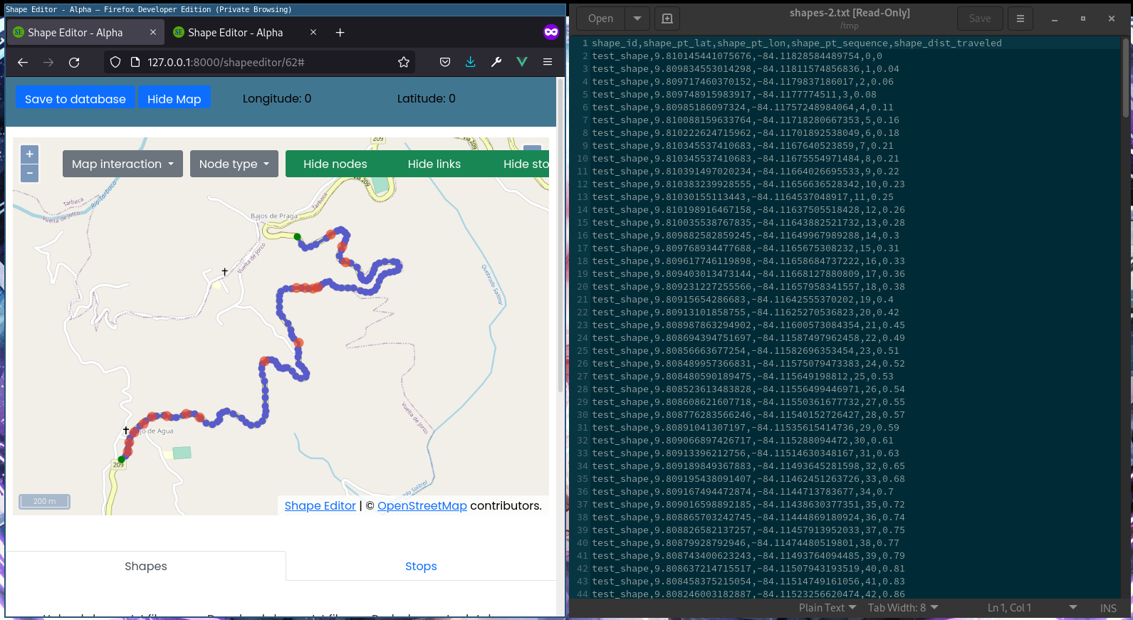 Shapes are made with nodes, nodes have a type, it could be endpoint for start or end of shapes, stops, these can be part of the shape too, fork are the nodes where are more than two links, waypoint are the common nodes. To create a Shape first draw paths clicking on map with the interaction add_node, when you already have a connection between two endpoints through multiple nodes and links add a Shape in the section below, once added the shape pick the waypoints with select_node + Shift, when you pick a waypoint and it is in a shape segment, the whole segment is selected, pick only waypoints their segments are in the shape.