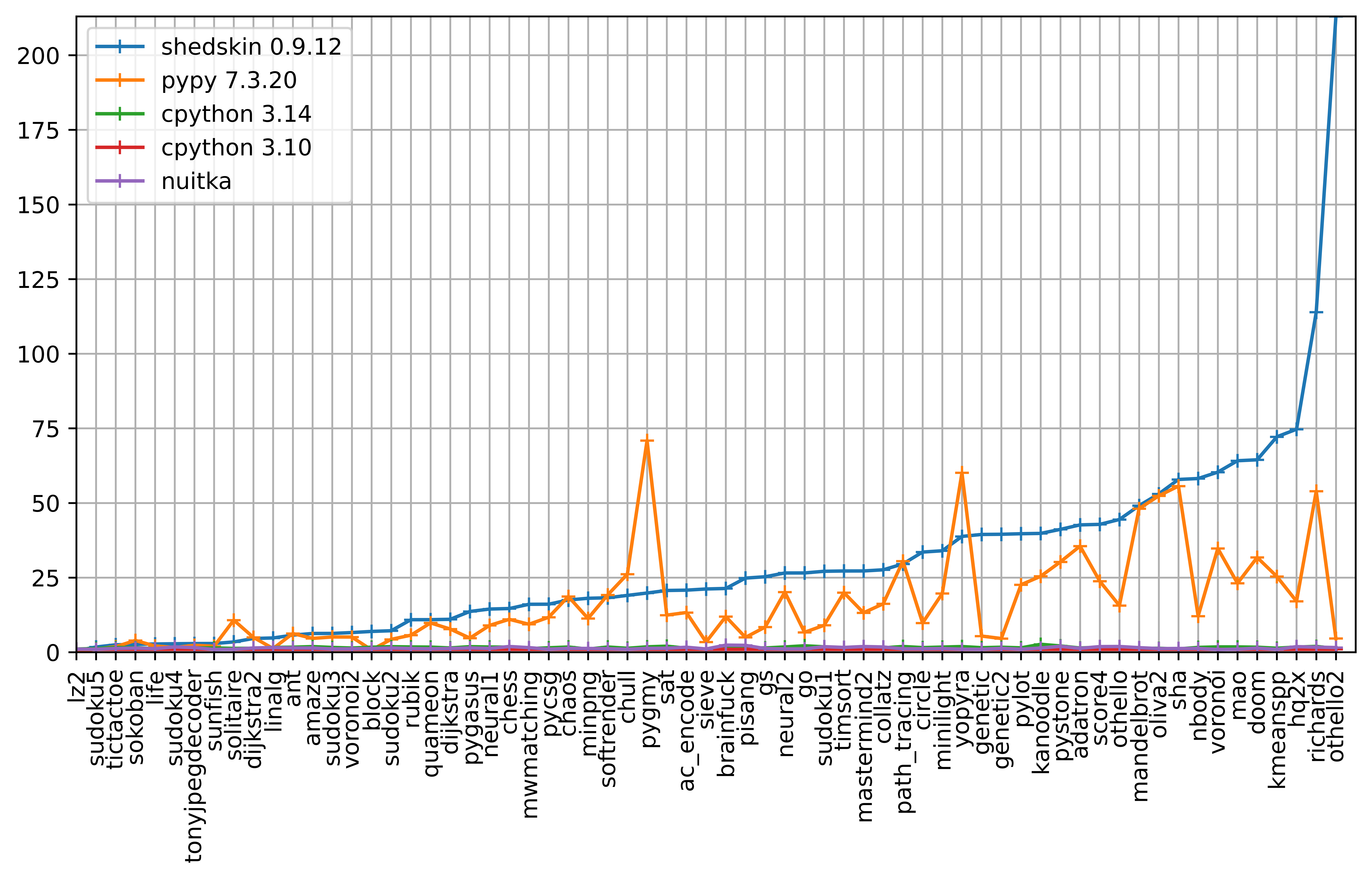 The following shows a comparison of speedups versus CPython 3.10 for Shed Skin and Pypy, for most of the Shed Skin examples.