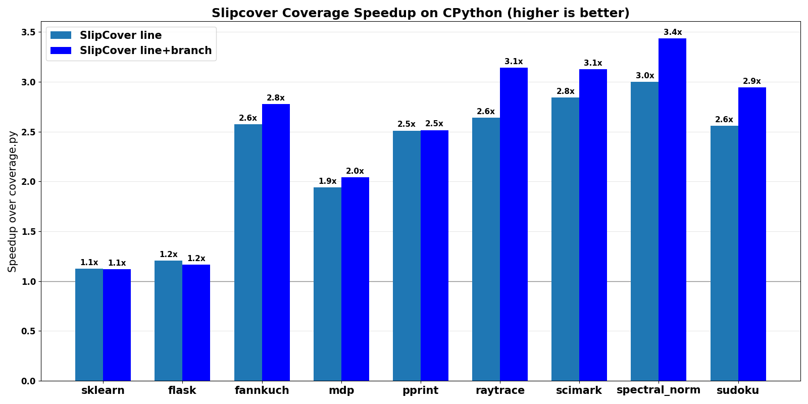 Past code coverage tools can make programs significantly slower; it is not uncommon for them to take twice as long to execute. SlipCover aims to provide the same information with near-zero overhead, often almost as fast as running the original Python program.