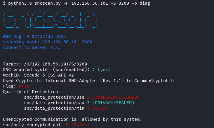 In its current state, sncscan can be used to read the SNC configurations for SAP Router and DIAG (SAP GUI) connections. The implementation for the SAP RFC protocol is currently in development.