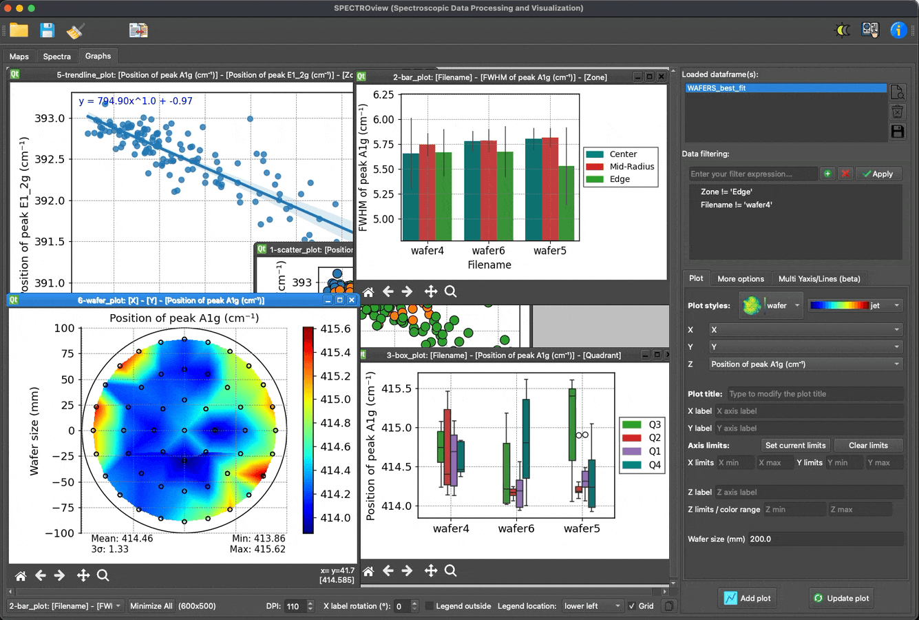 Spectroscopy techniques (such as Raman, Photoluminescences, XRD, XPS…) are widely used in various fields, including materials science, chemistry, biology, and geology. In recent years, these techniques have increasingly found their place in cleanroom environments, particularly within the microelectronics industry, where they serve as critical metrology tools for wafer-scale measurements. The data collected from these in-line measurements (wafer data) require specific processing, but existing software solutions are often not optimized for this type of data and typically lack advanced plotting and visualization capabilities. Additionally, the licensing requirements of these software solutions can restrict access for a broader community of users.