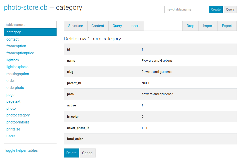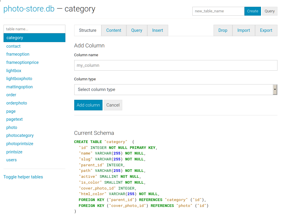 The structure tab displays information about the structure of the table, including columns, indexes, triggers, and foreign keys (if any exist). From this page you can also create, rename or drop columns and indexes.