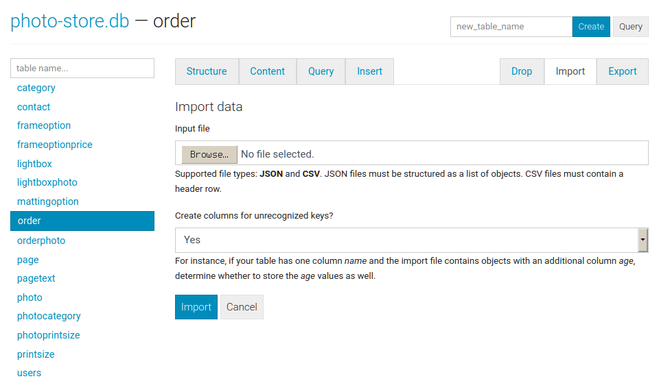 The import tab supports importing CSV and JSON files into a table. There is an option to automatically create columns for any unrecognized keys in the import file: