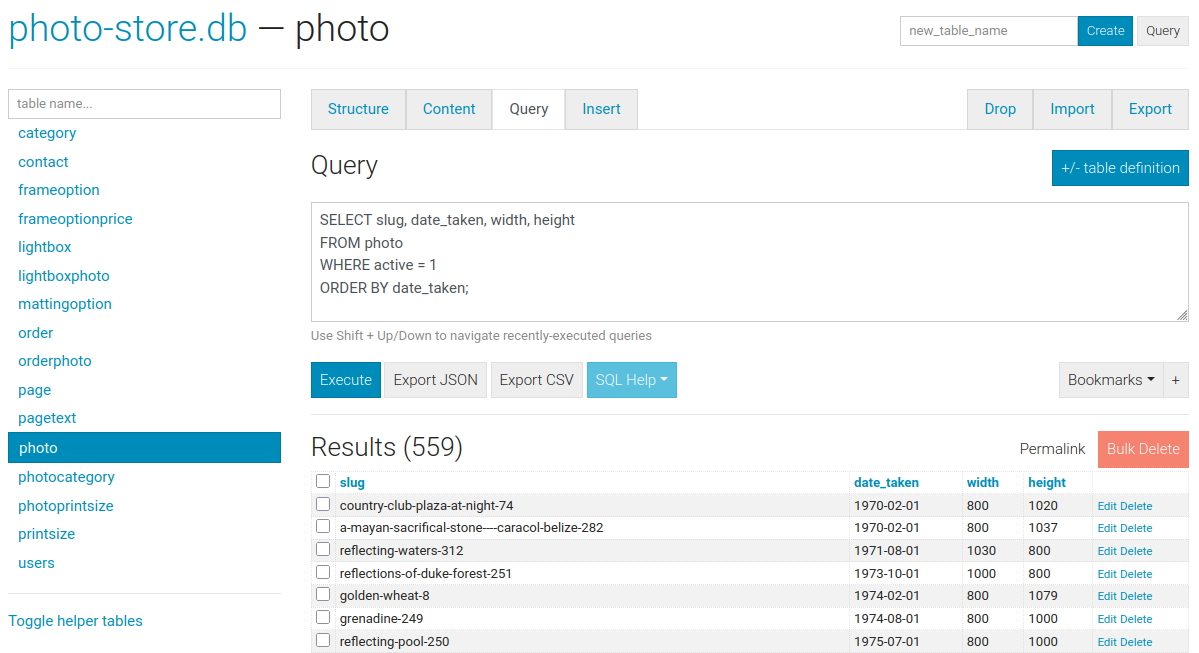 The query tab allows you to execute arbitrary SQL queries on a table. The query results are displayed in a table and can be exported to either JSON or CSV: