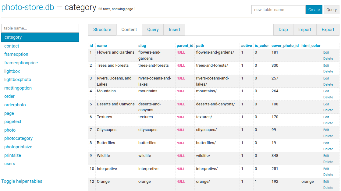 The structure tab displays information about the structure of the table, including columns, indexes, triggers, and foreign keys (if any exist). From this page you can also create, rename or drop columns and indexes.