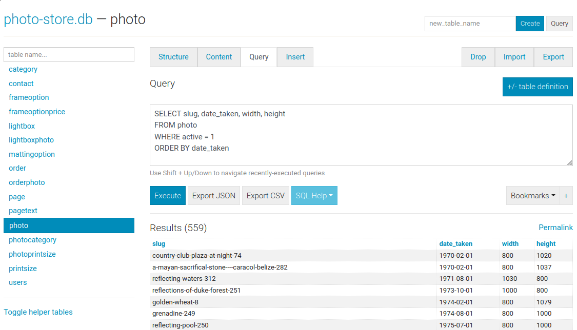 The query tab allows you to execute arbitrary SQL queries on a table. The query results are displayed in a table and can be exported to either JSON or CSV: