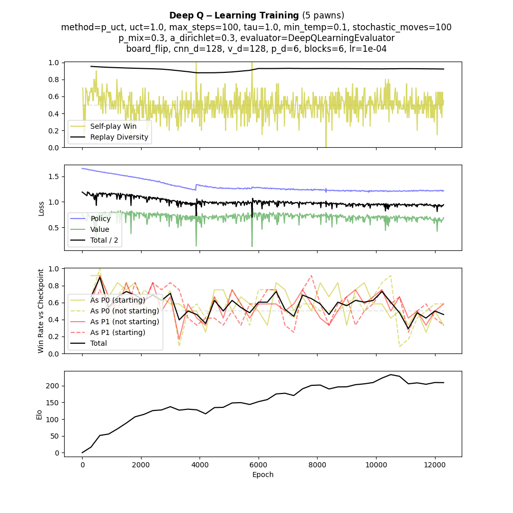 - The win rate against its checkpoint is above 50% (checkpoint is replaced by the current model when the win rate goes above 70%)