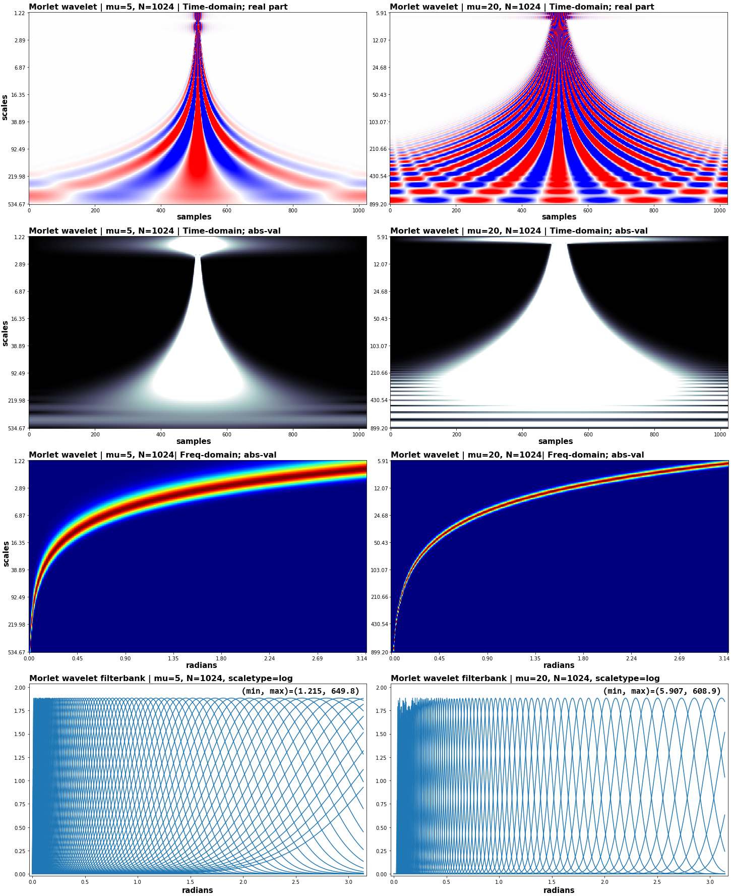 ssqueezepy is equipped with a visualization toolkit, useful for exploring wavelet behavior across scales and configurations. (Also see explanations and code)