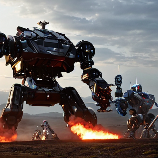 | Large futuristic mechanical robot in the foreground of a baroque-style battle scene, photorealistic, high quality, 8k | |