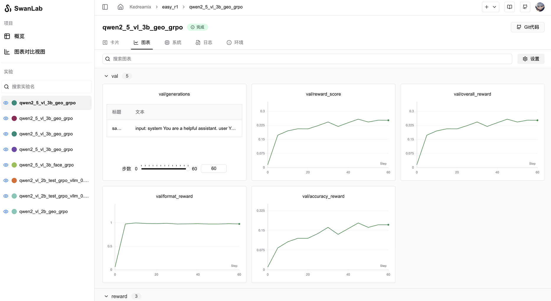 2025.02.24:我们与 EasyR1 完成了联合集成,现在你可以在EasyR1中使用SwanLab来跟踪和可视化多模态大模型强化学习实验,使用指引