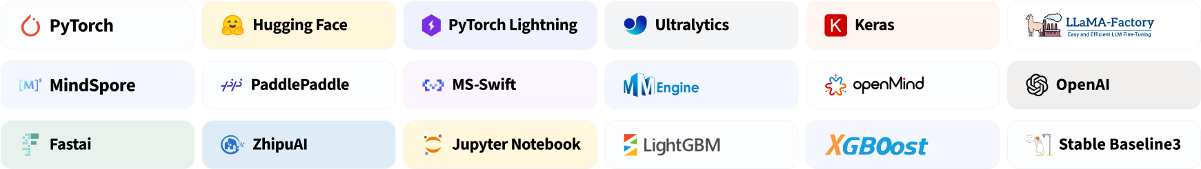 2. ⚡️ 全面的框架集成: PyTorch、🤗HuggingFace Transformers、PyTorch Lightning、🦙LLaMA Factory、MMDetection、Ultralytics、PaddleDetetion、LightGBM、XGBoost、Keras、Tensorboard、Weights&Biases、OpenAI、Swift、XTuner、Stable Baseline3、Hydra 在内的 30+ 框架