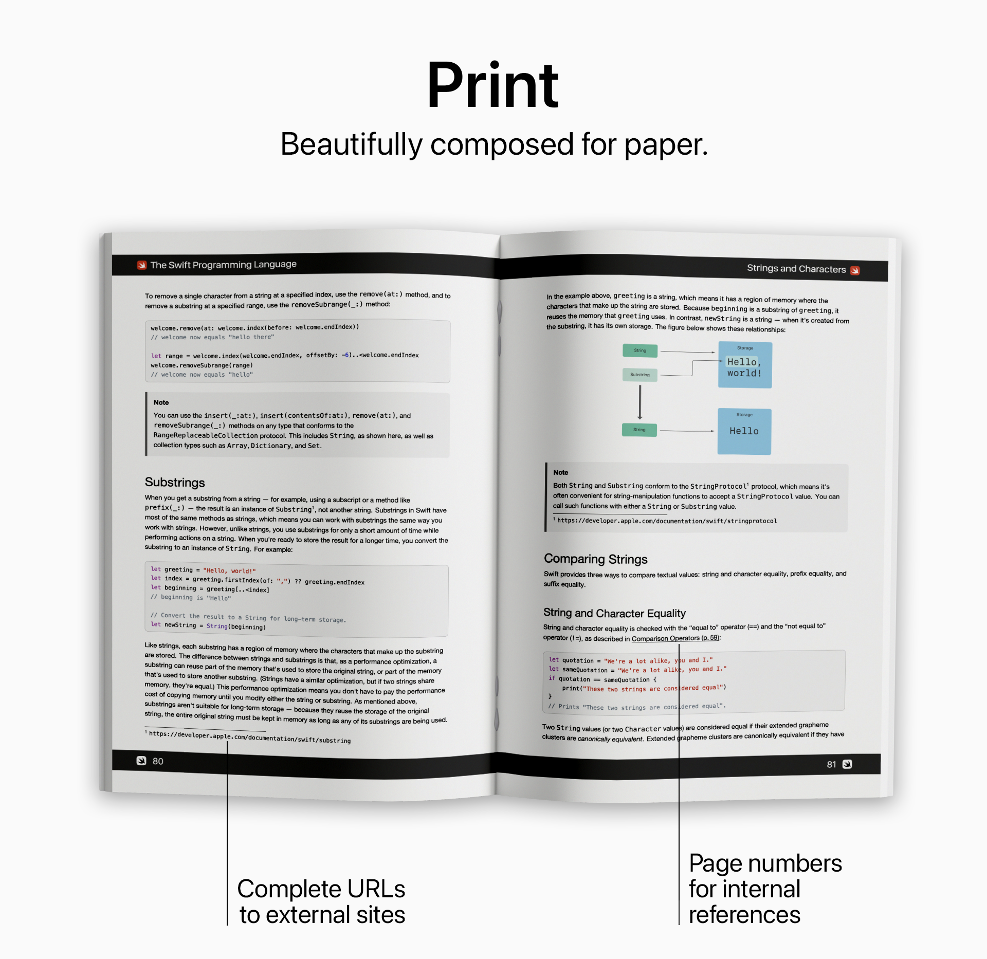 - Print mode with page numbers accompanying cross-references between chapters and full URLs shown in footnotes for external links.