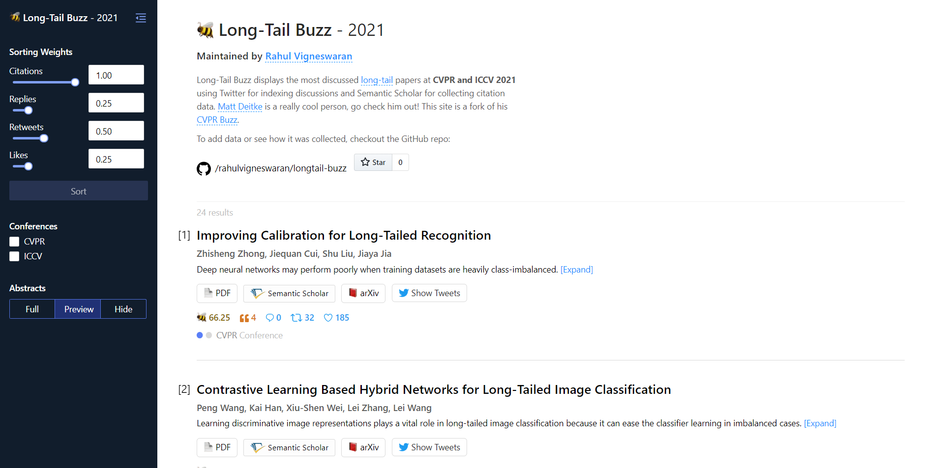 🐝 Long-tail buzz : If you are interested in deep learning research which involves long-tailed / imbalanced dataset, take a look at Long-tail buzz to learn about the recent trending papers in this field.