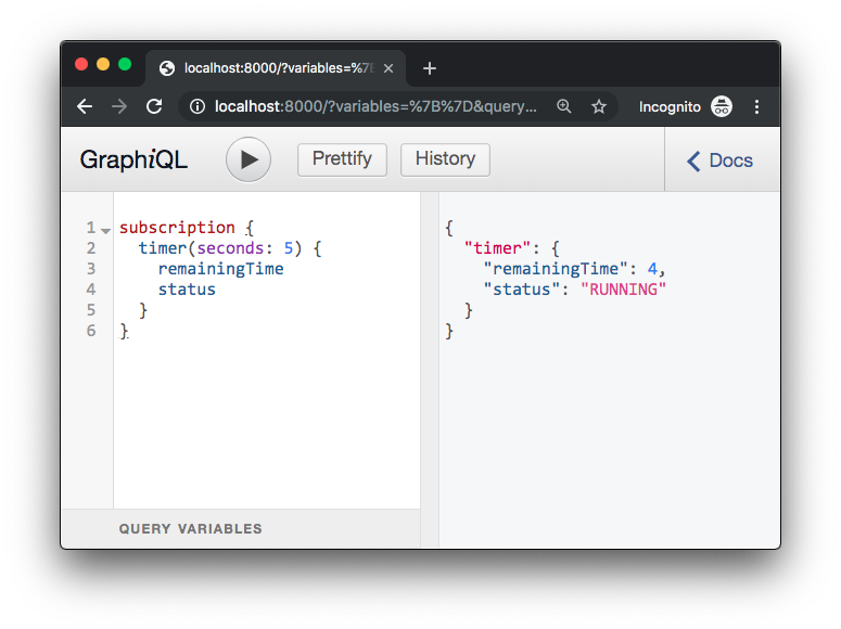 Save this file as graphql.py, then run $ uvicorn graphql:app. Open the GraphiQL client at http://localhost:8000, and hit "Play"! The timer should update on real-time.