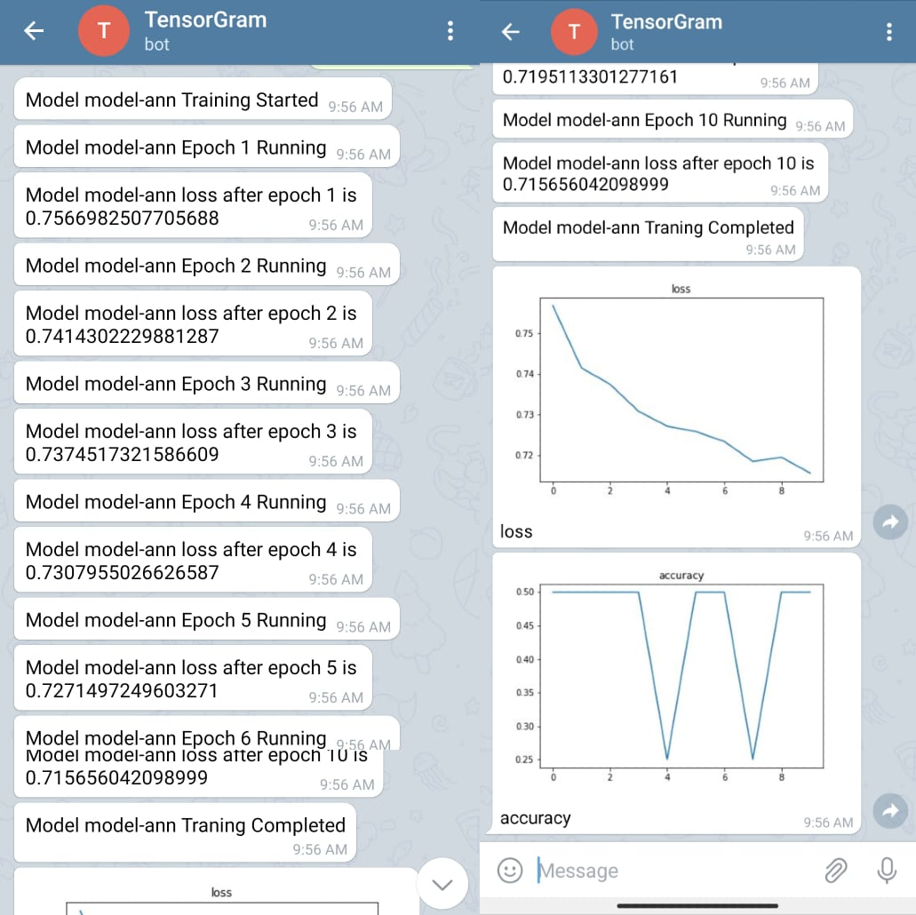 - Now we need to create a object of TensorGram by specifying the following attributes like model name and chat id which you obtained before.