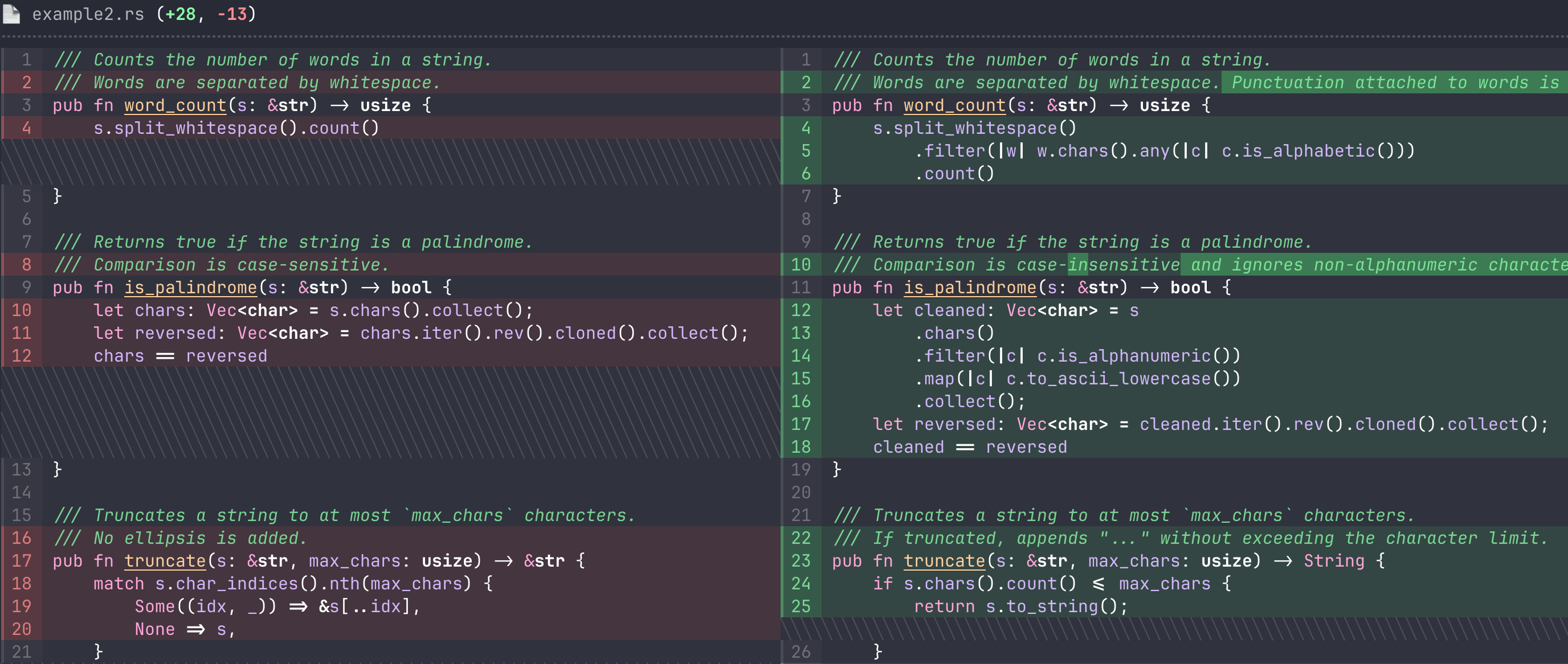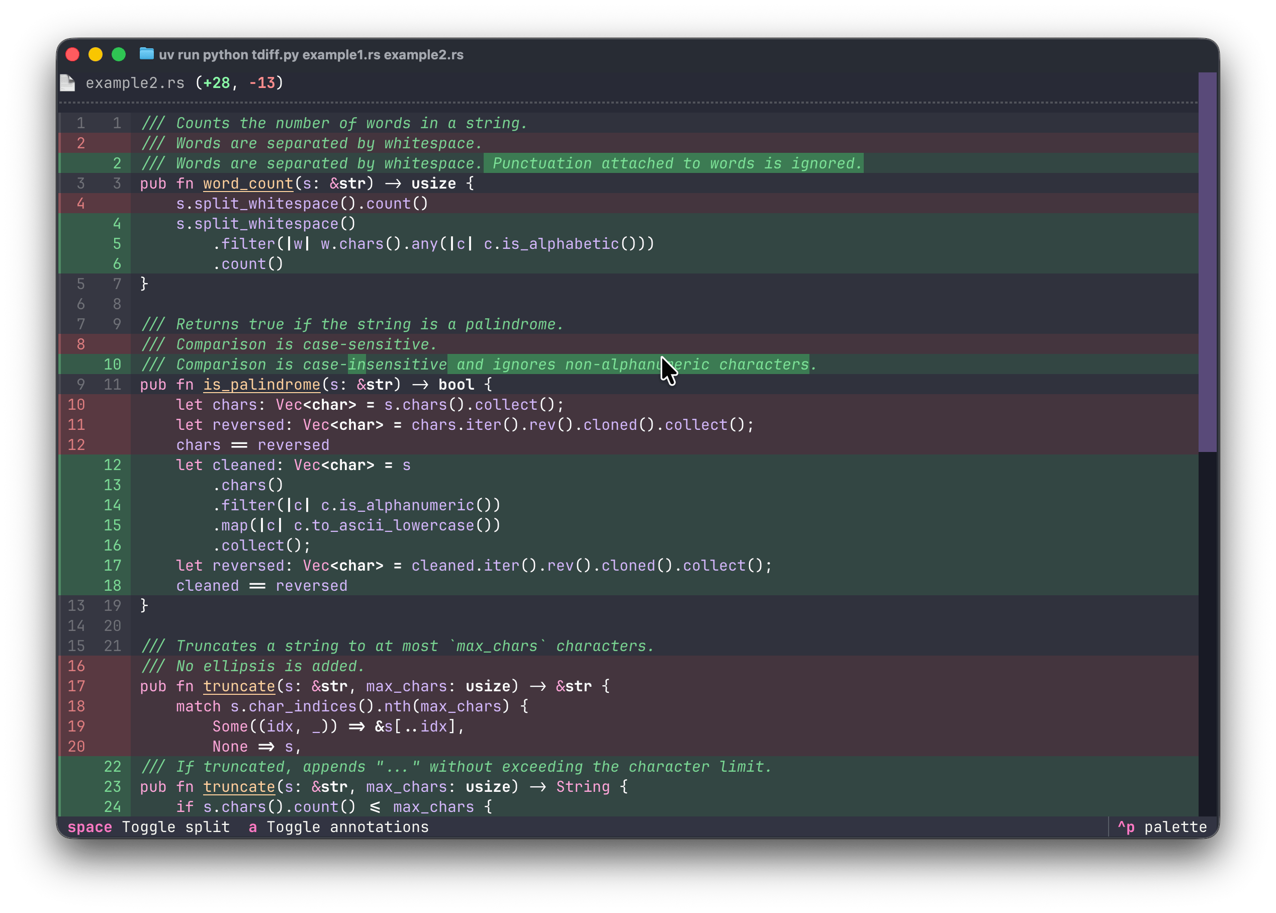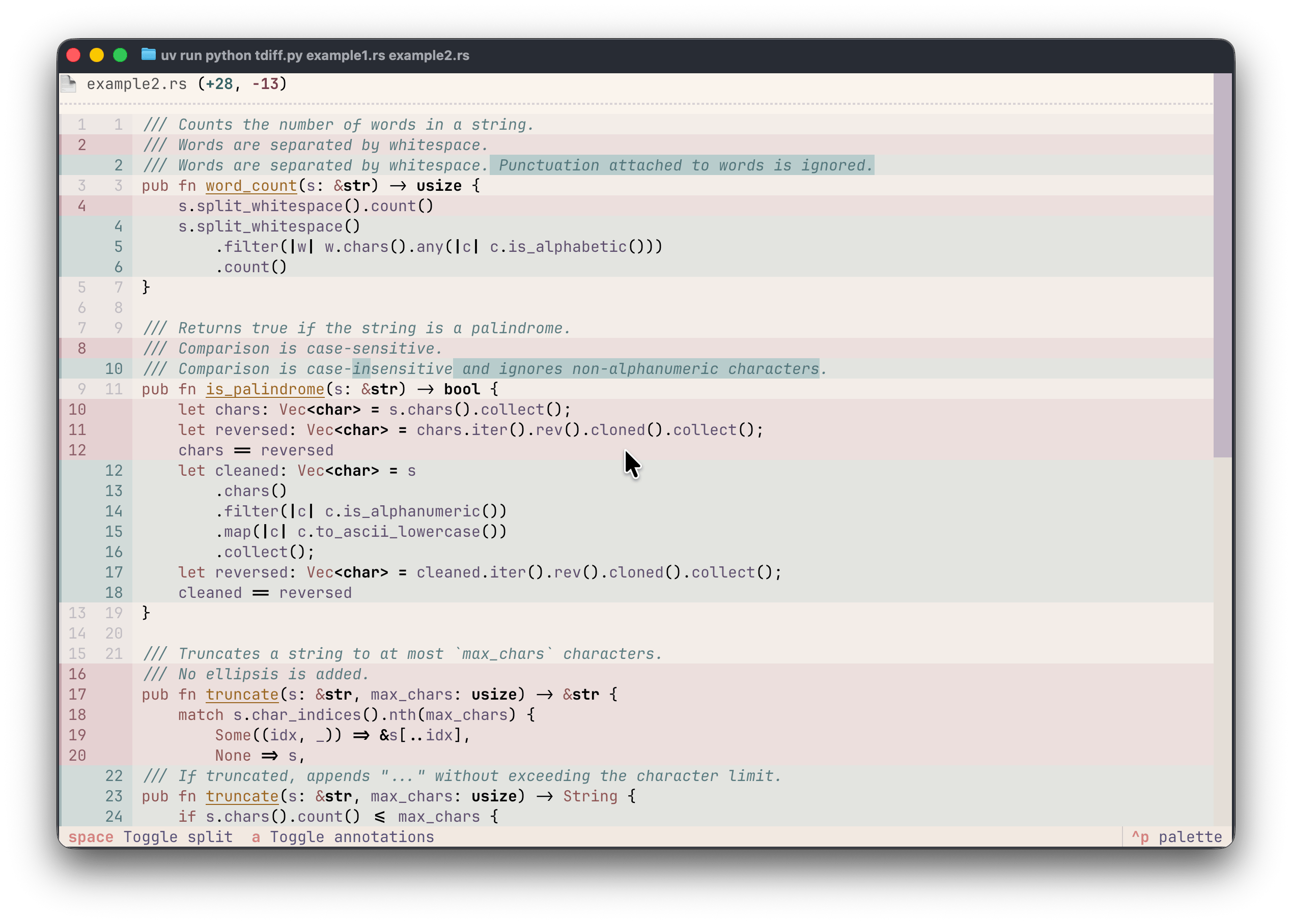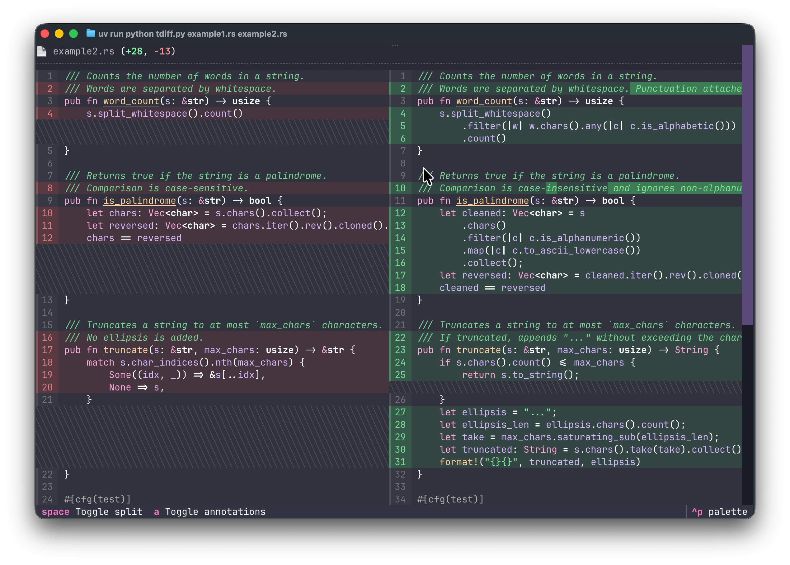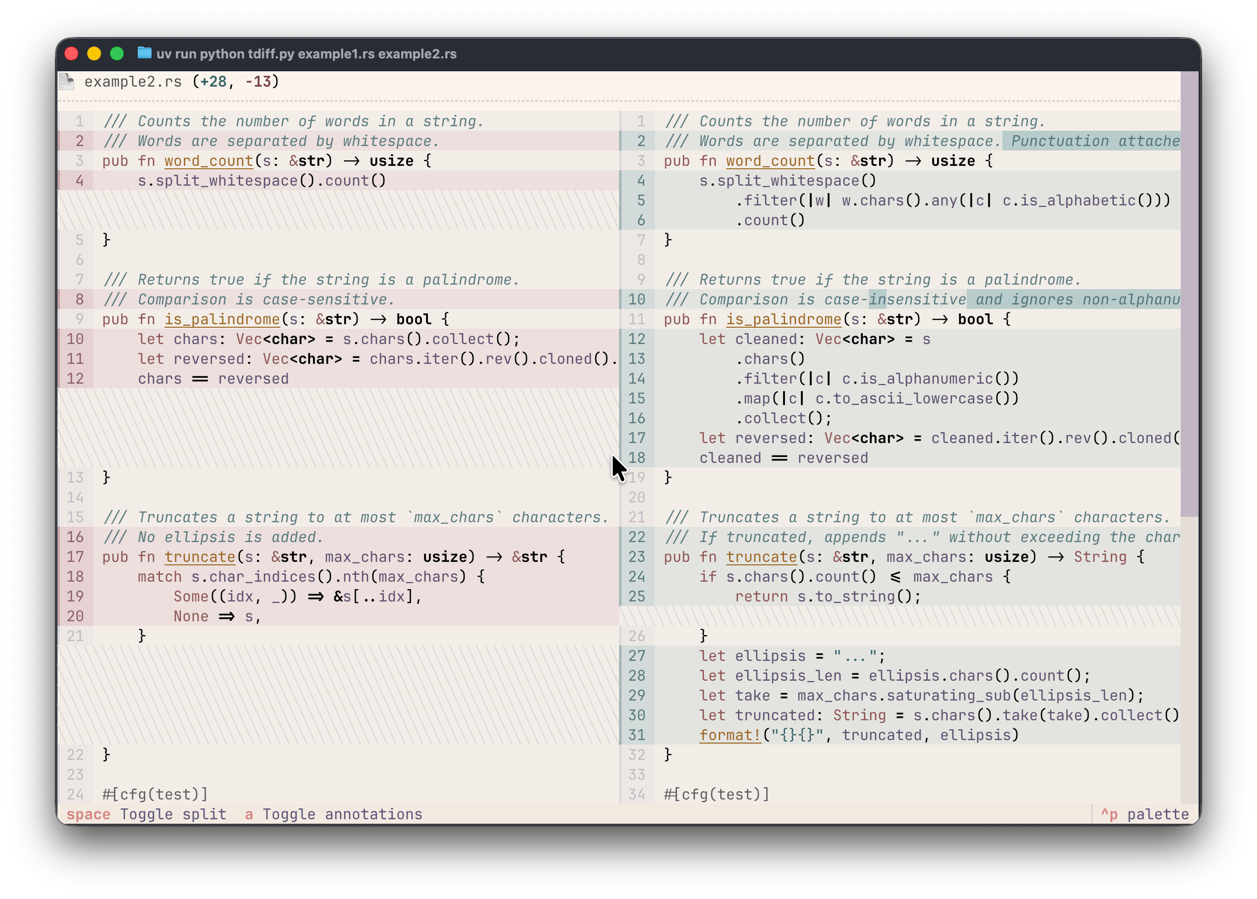 • Swappable diff methods. There is no perfect diff algorithm. They all have their trade-offs. The DiffView widget uses Python's difflib but it could offer an interface to add other diff algorithms.