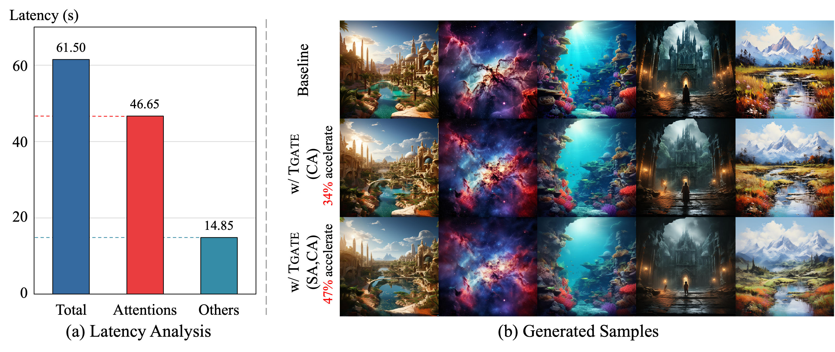 TGATE accelerates inferences of [PixArtAlphaPipeline], [PixArtSigmaPipeline], [StableDiffusionPipeline], [StableDiffusionXLPipeline], and [StableVideoDiffusionPipeline] by skipping the calculation of self-attention and cross-attention once it converges. More details can be found at technical report.