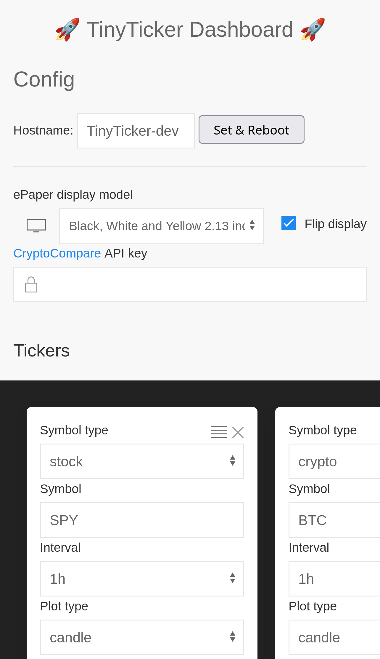 tinyticker uses a Raspberry Pi zero W and a small ePaper display to periodically display a stock or crypto chart.