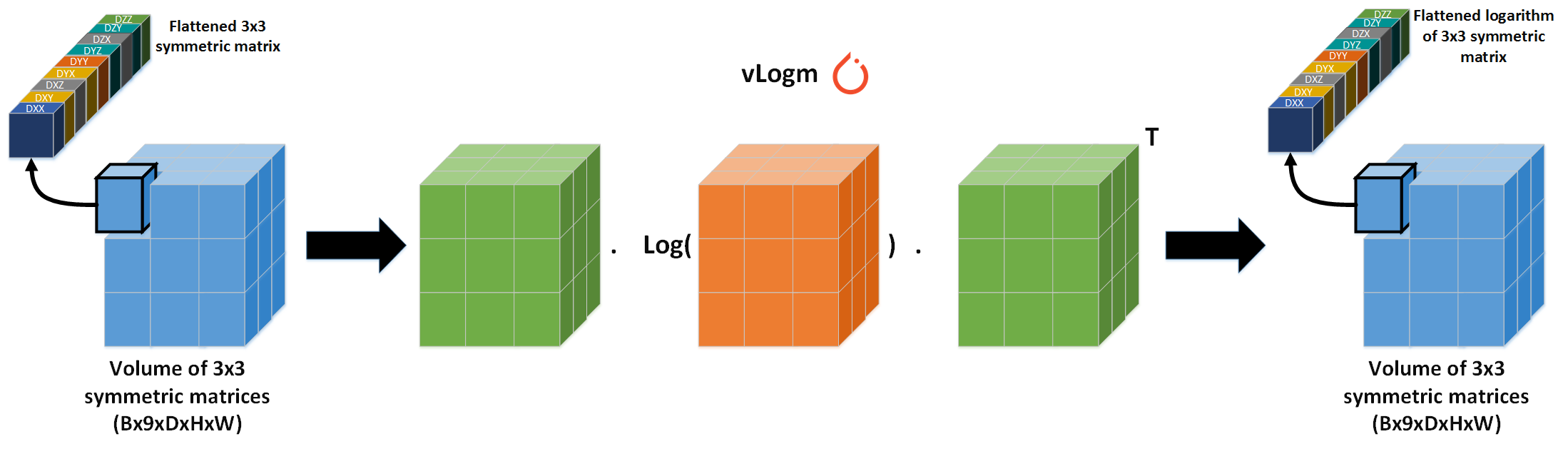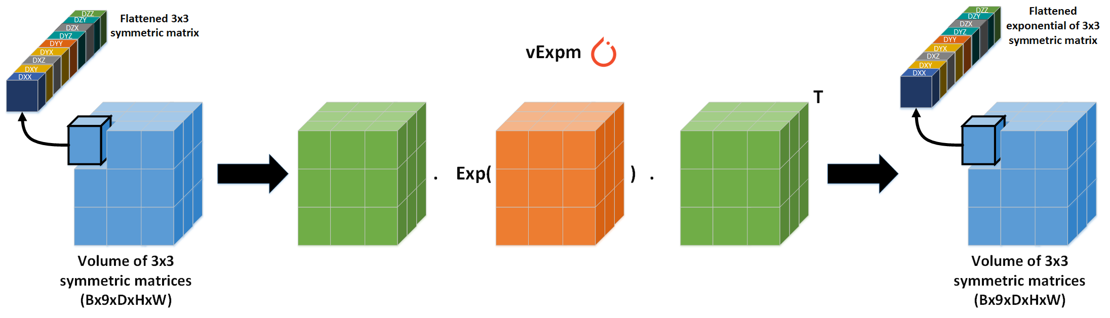 Batched and vectorized operations on volume of 3x3 symmetric matrices with Pytorch. The current Pytorch's implementation of batch eigen-decomposition is very slow when dealing with huge number of small matrices (e.g. 500k x 3x3). This library offers some basic functions like vSymEig, vExpm and vLogm for fast computation (>250x faster) of huge number of small matrices with Pytorch using an analytical solution.
