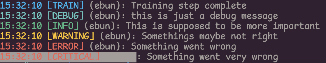 Nice colorful logging module, which also includes an extra level TRAIN for model train etc.