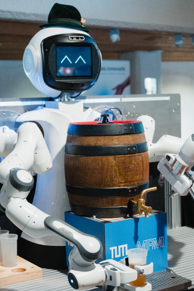 Robotic two-arm demonstrator serving beer from a keg as shown at Geriatronics Summit 2024. Watch a video of the demo here.