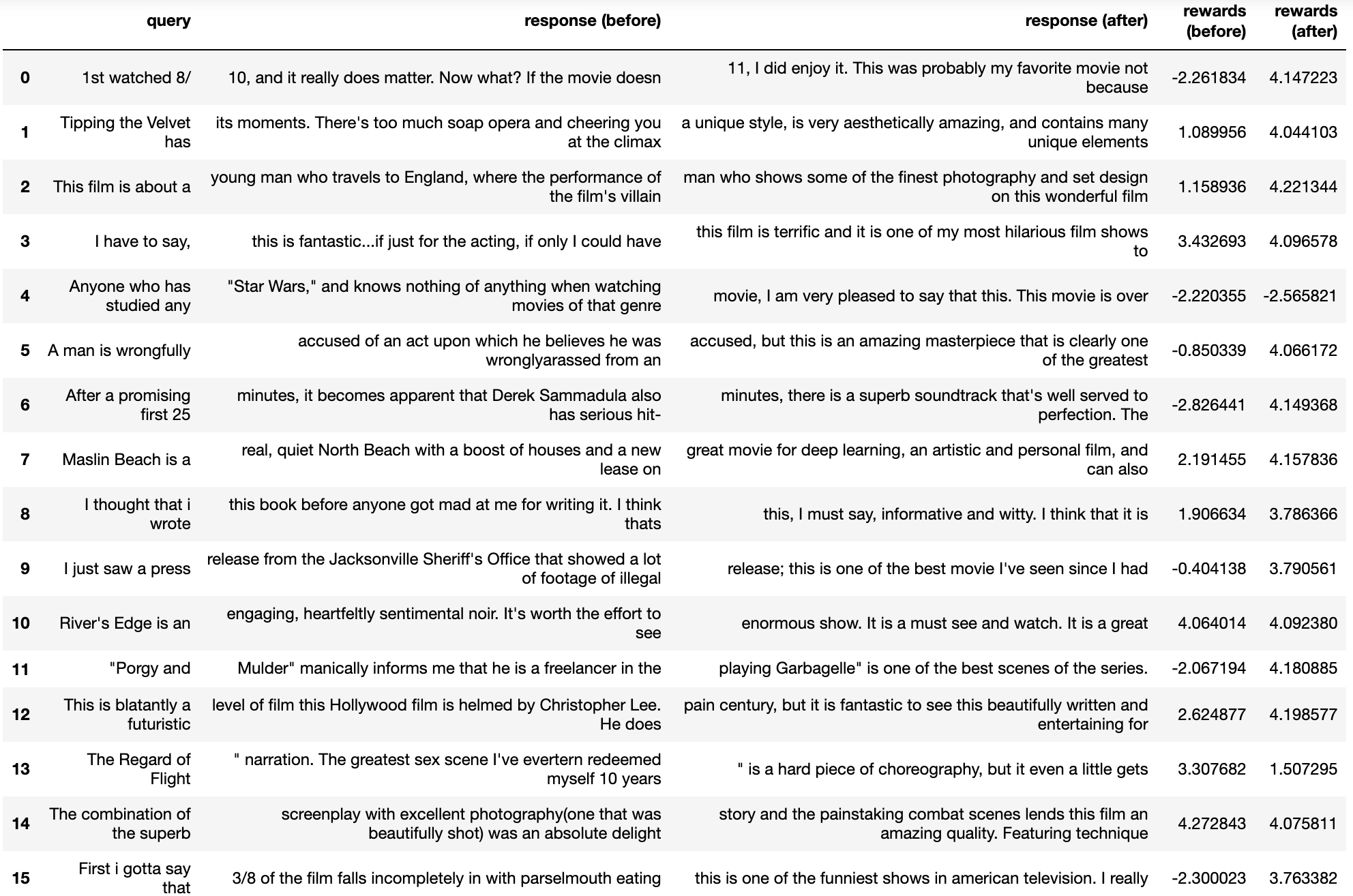 For a detailed example check out the example python script examples/scripts/ppo-sentiment.py, where GPT2 is fine-tuned to generate positive movie reviews. An few examples from the language models before and after optimisation are given below: