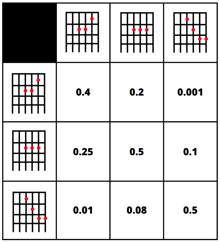Example of how a transition matrix might look like, values are inaccurate and the matrix may be way bigger :