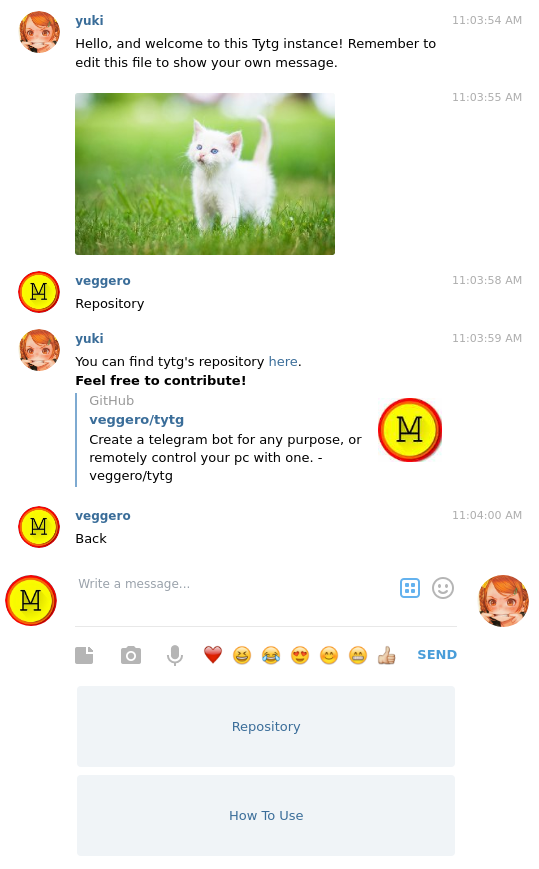TyTg allows users to navigate in a folder in a hosting pc. Directories are shown as Telegram buttons, allowing the creation of custom bots. Also, *.txt files are sent as messages, *.png &co are sent as images. You can also create *.tgfile containing a Telegram ID to send files. This allows to create bots by simply managing directories.