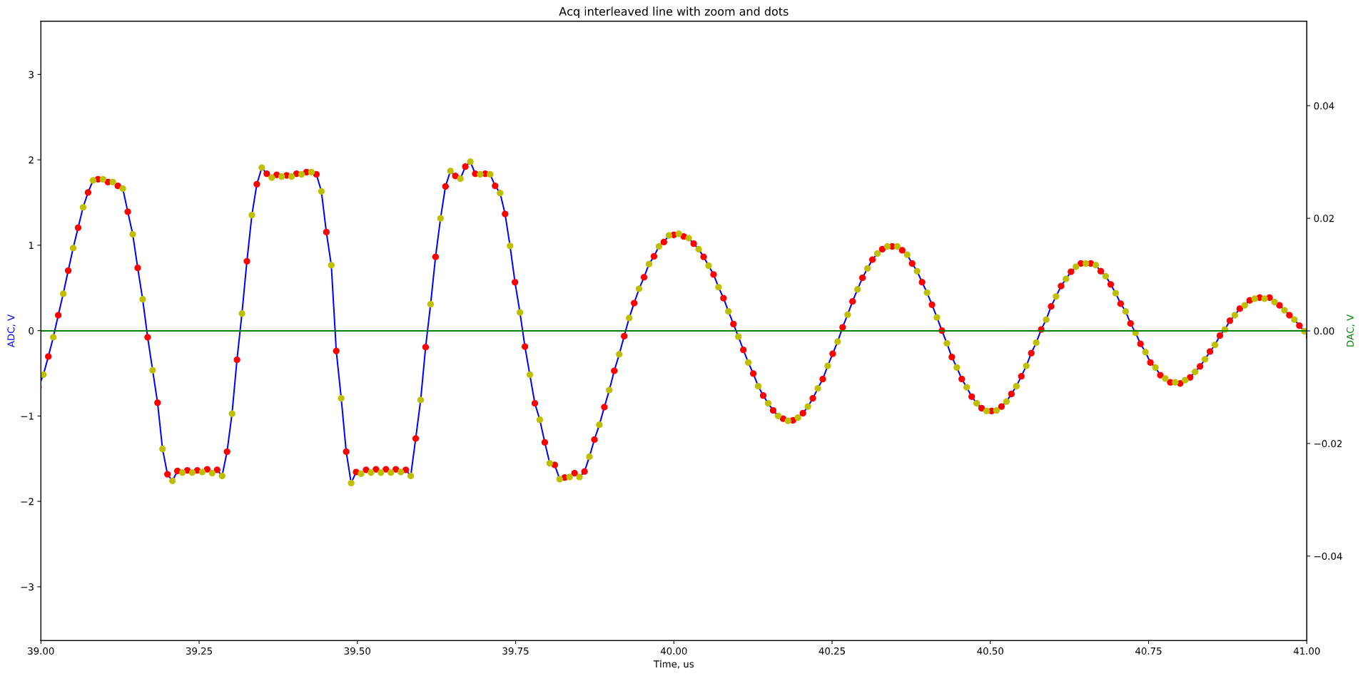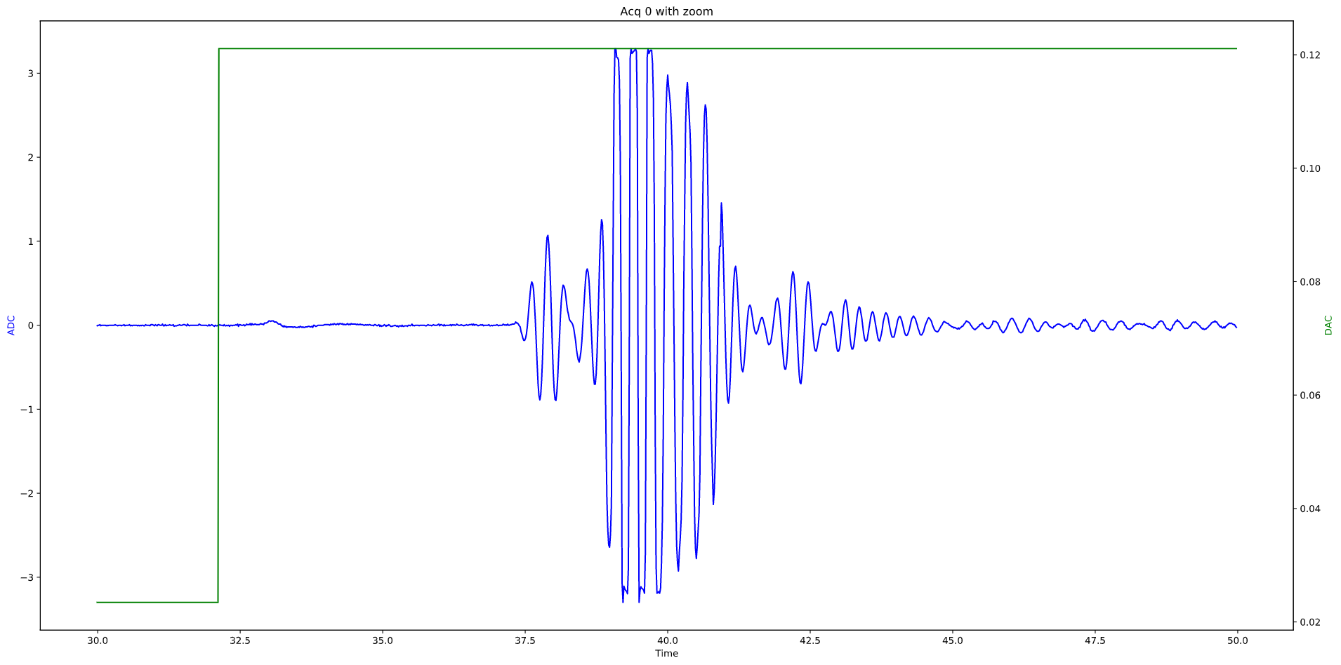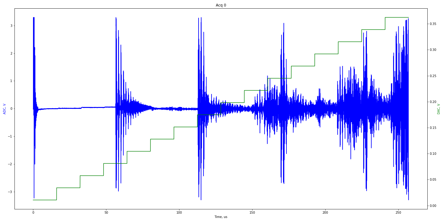 And do acquisitions with acq_res = fpga.do_acquisition(acq_lines=32, gain=gain, double_rate=True) which will return an array of acq_lines acquisitions, of length 256us at 64Msps.