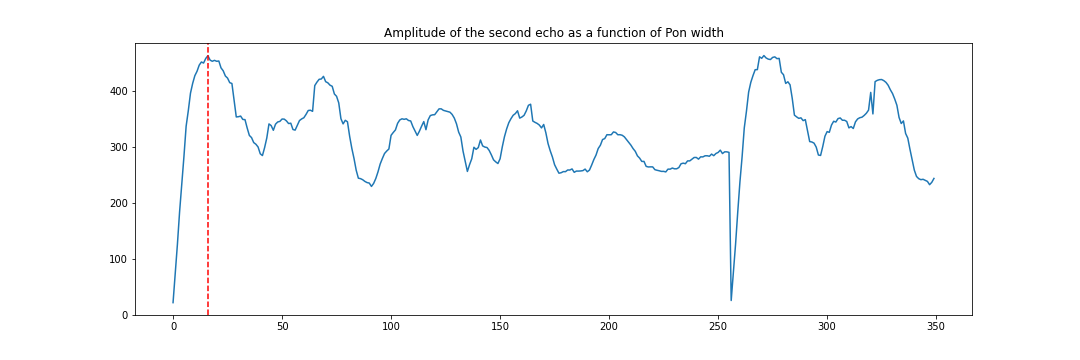 Below is plotted amplitude of an echo as a function of the fpga.csr.ponw for a 4MHz transducer. One sees that a setting at 16 provides most