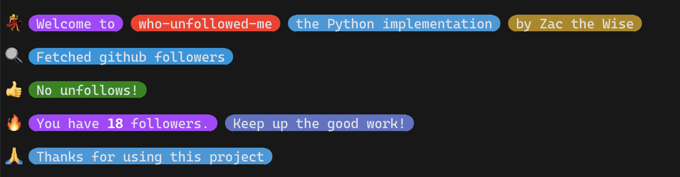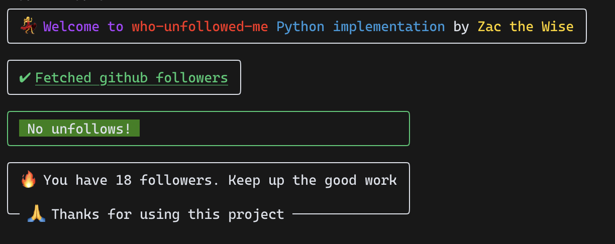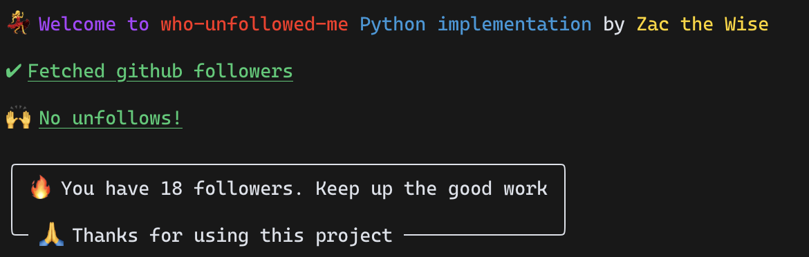 The first time you run the tool, you will be asked to enter your GitHub username. Subsequent runs will show any unfollowers, with names and links.