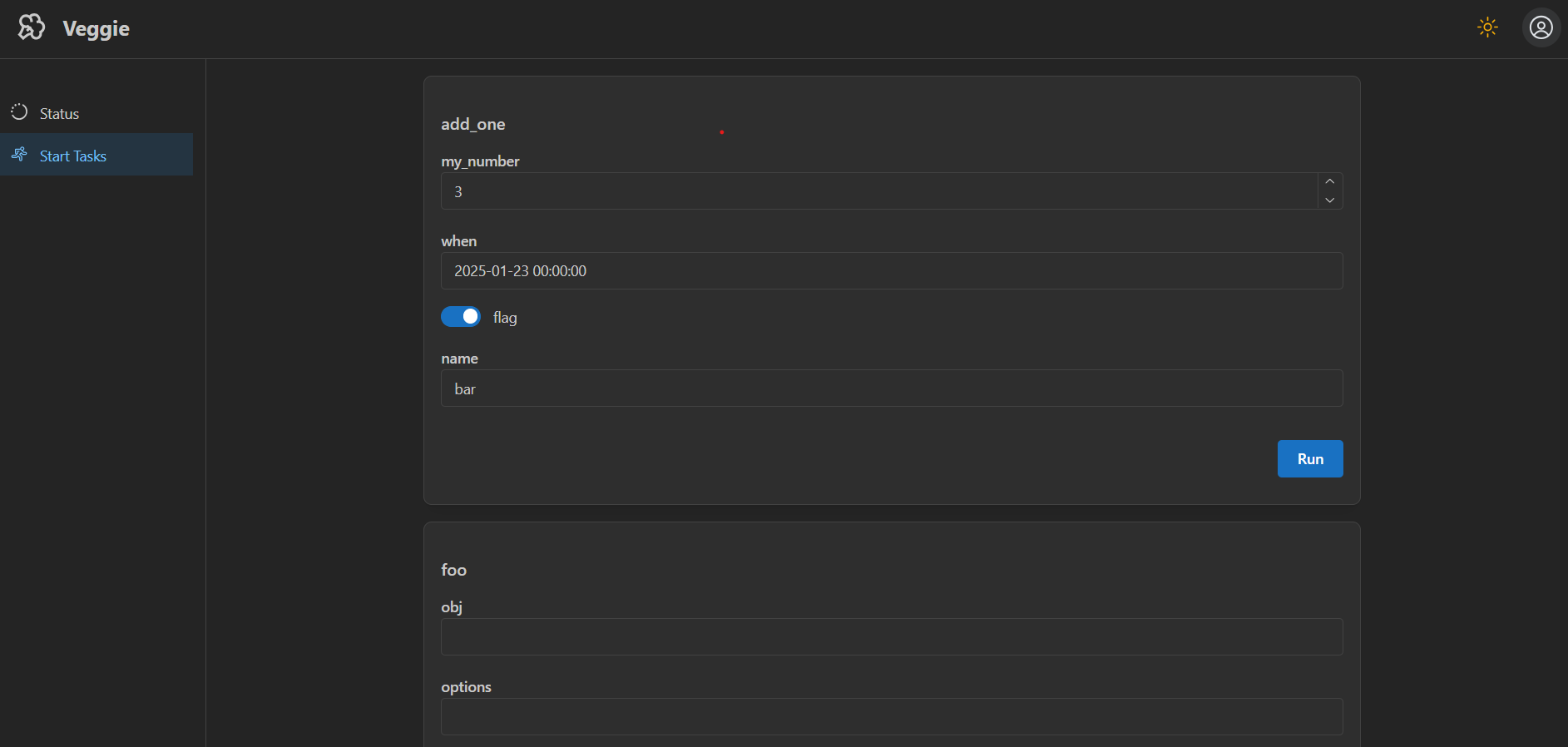 Start a new task by entering values for its parameters through the UI: