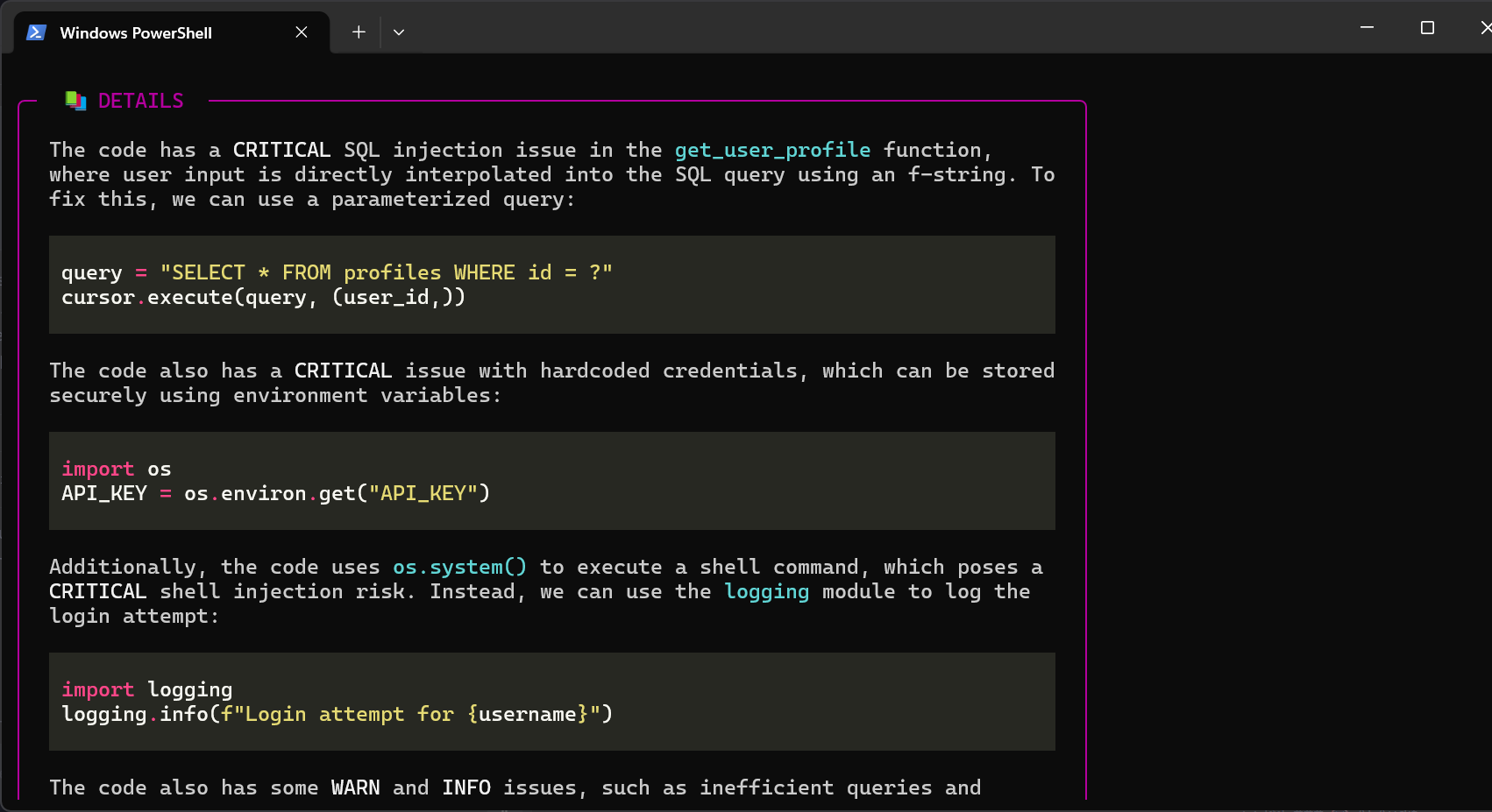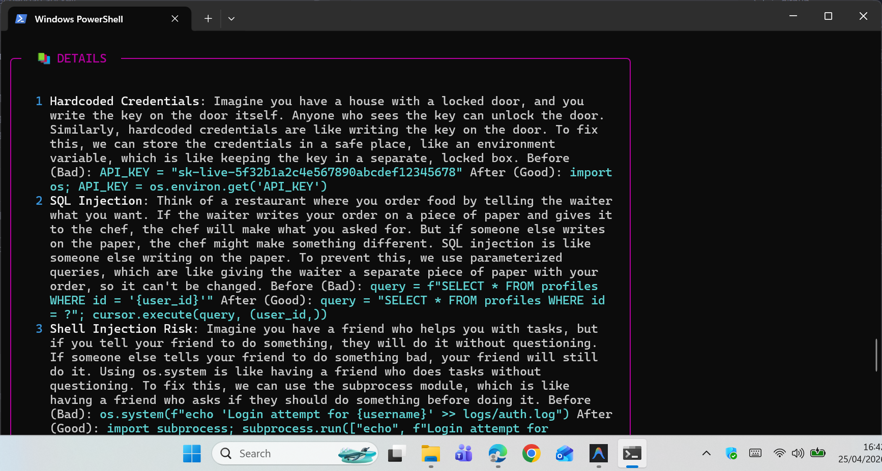 Switch to --learn mode to get complex technical flaws explained through simple real-world analogies. Perfect for junior developers and students.